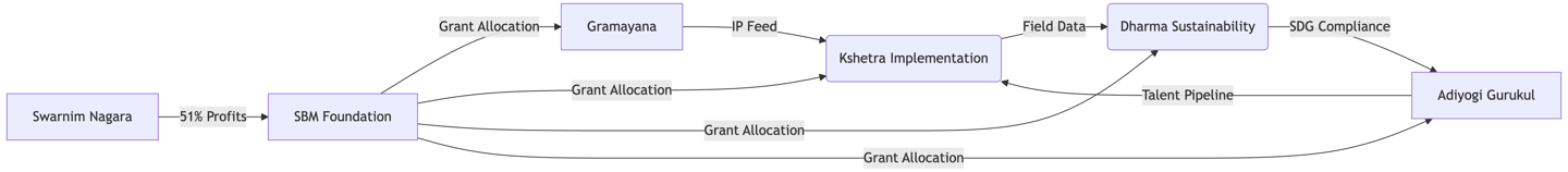Key Divisions are: 1. Dharma Sustainability Council (Nonprofit) 2. Gramayana: Civilizational Knowledge Matrix (Nonprofit) 3. Kshetra Implementation Wing (Nonprofit) 4. Adiyogi Gurukul (Nonprofit) and 5. Swarnim Nagara (For-Profit)